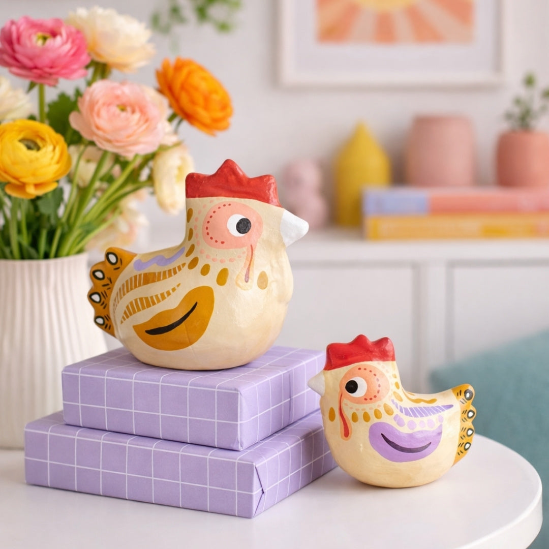 Ob als Teil deiner Osterdekoration, auf dem Esstisch, im Regal oder kombiniert mit anderen Frühlingsaccessoires – das Huhn lässt sich vielseitig einsetzen und fügt sich harmonisch in dein Zuhause ein.