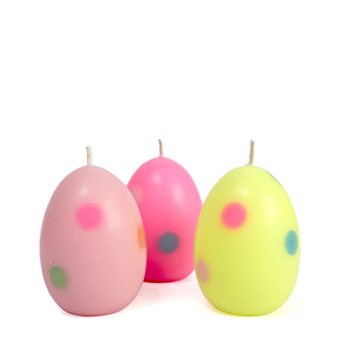 Drei Osterkerzen in leuchtendem Neongelb, Neonpink und Rosa. In jede Kerze sind von Hand bunte Punkte eingearbeit. Sie machen jede Kerze zu einem echten Unikat.